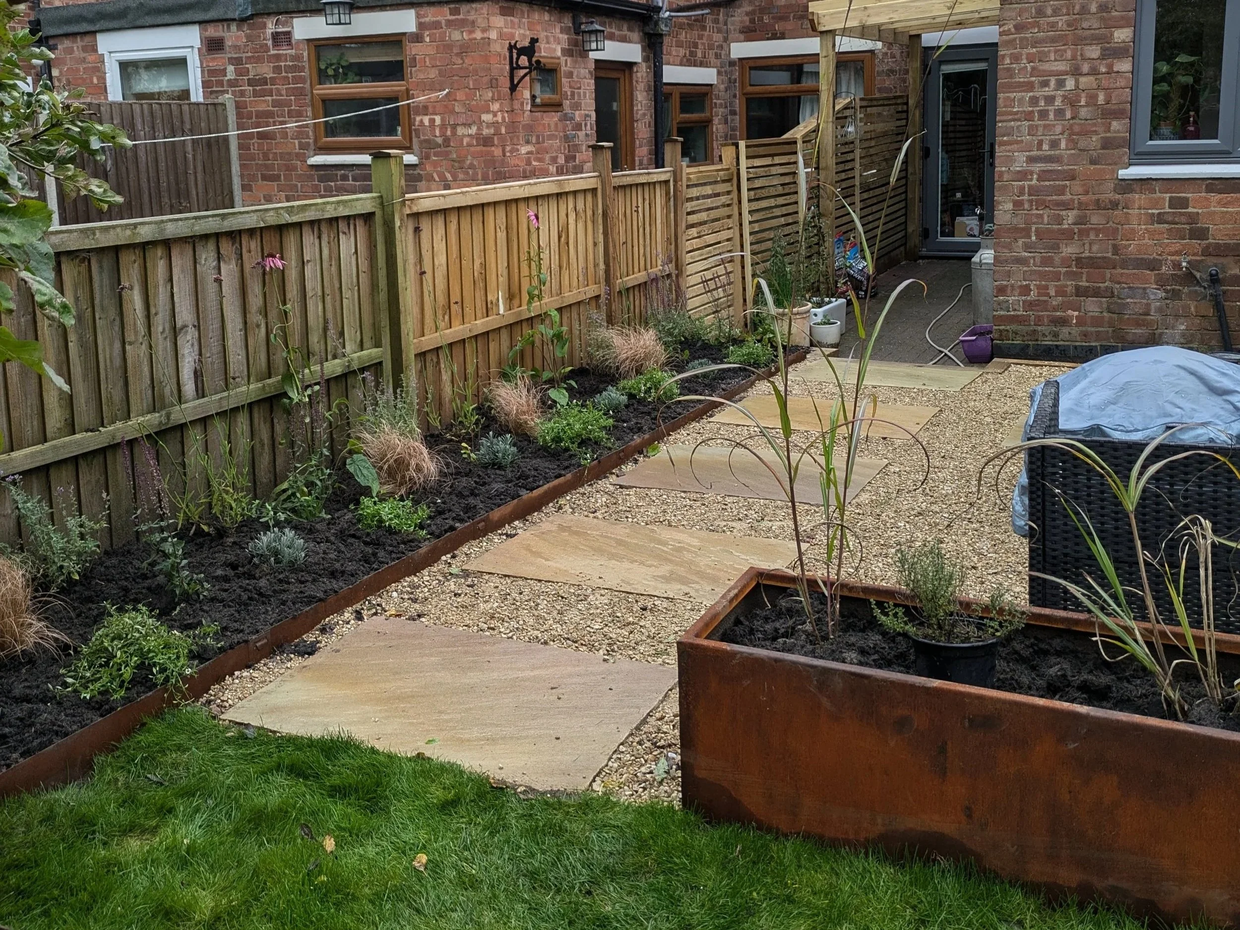 The materials used were a mix of traditional and modern using a feature of corten steel as edging and planters. The fire pit was designed to be closer in the shady part of the garden replacing wet and mossy lawn. The gravel boards were core drilled to have gaps for hedgehogs, the steps had a mini step up for the existing hedghog and a hog house was carefully positioned for the feeding of the hedgehogs.